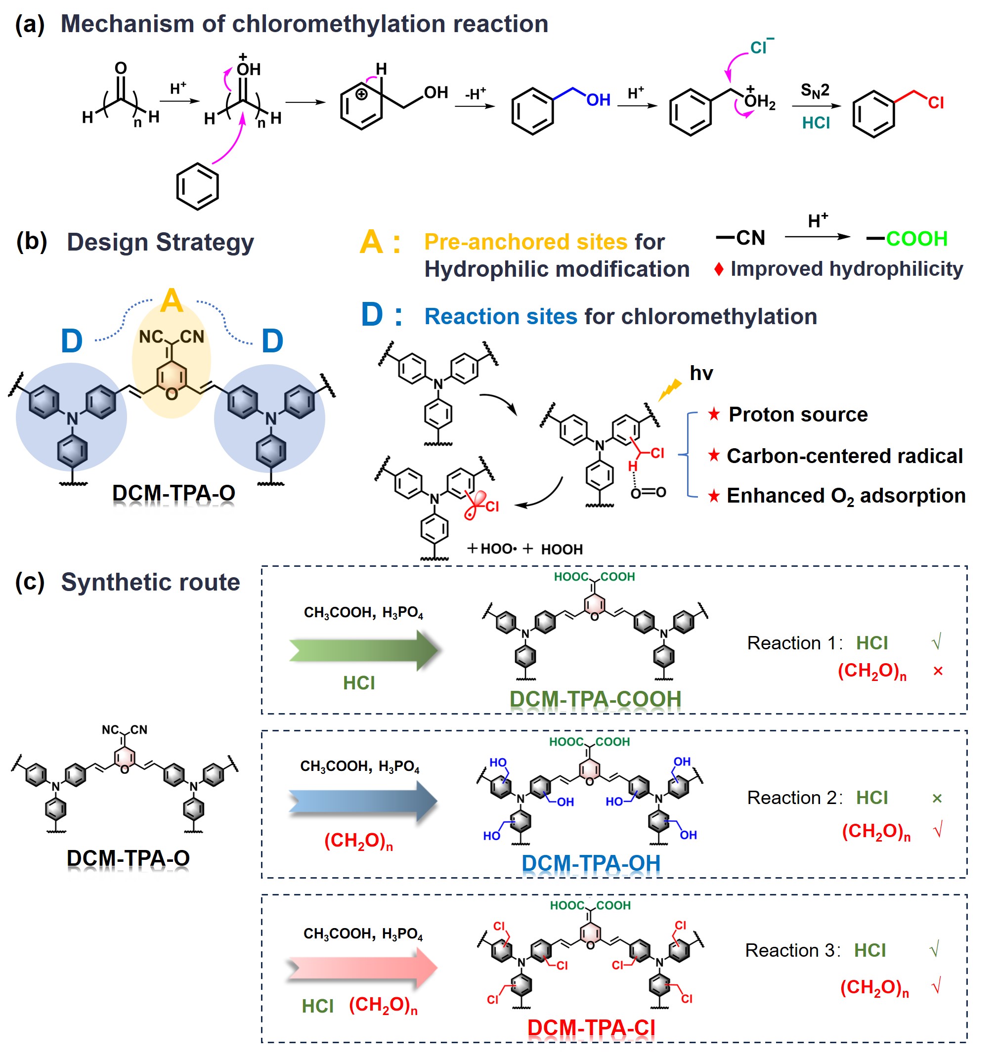 (1)針對氧氣吸附能力不足的問題,在CMPs材料中通過后修飾反應引入吸電子基團是解決此問題的好方法(圖1)。在之前的工作中引入磺酸基和季銨鹽(Adv. Funct. Mater.2025, 35, 2415244)的基礎上,我們首次將氯甲基引入CMPs中用于高效生產(chǎn)H2O2。在聚合物催化劑的制備中,氯甲基修飾的聚合物常用作傅-克烷基化等交聯(lián)反應的中間體,因其疏水性而未在光催化產(chǎn)H2O2領域引起重視。經(jīng)典的Blanc氯甲基化反應常用聚甲醛和鹽酸為氯甲基化試劑,磷酸或冰醋酸等為縮合劑?;诖?,我們在材料設計中以三苯胺為反應位點,以氰根為酸化位點,通過一步氯甲基化反應,同時引入氯甲基和羧基,分別用于增強氧氣吸附和改善親水性。經(jīng)氯甲基修飾的CMPs在純水和空氣中的產(chǎn)H2O2速率達到5.0 mmol g-1 h-1,在氧氣氛圍中的性能僅增長1.8%,證明其氧氣吸附能力之強。而在苯甲醇和水的混合溶劑中性能更是達到了38.0 mmol g-1 h-1,超過大多數(shù)目前已報到的催化劑。該工作以Chloromethylation modified pyranonitrile-based conjugated microporous polymers for selective one-step two-electron O2 reduction to H2O2為題,發(fā)表在化學領域頂級期刊Angew. Chem. Int. Ed.2025, 64, e202508436。