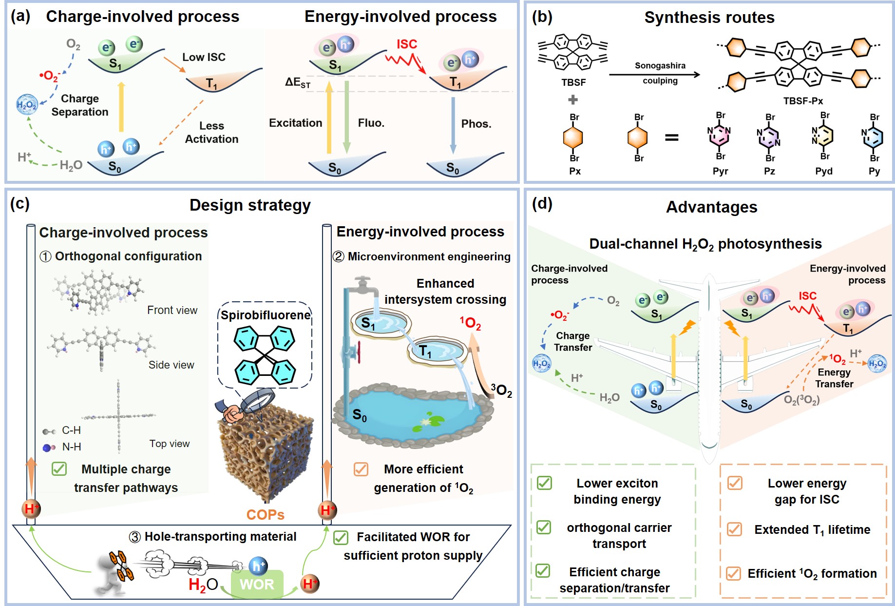 (3)針對能量路徑較弱的問題,我們探索了將傳統(tǒng)的電荷路徑與能量路徑耦合的策略。能量路徑是指以單線態(tài)氧(1O2)為關鍵中間體生產(chǎn)H2O2,1O2主要由三線態(tài)氧(3O2)產(chǎn)生,此過程涉及從三重激發(fā)態(tài)(T1)回到基態(tài)(S0)的能量轉移。目前大多數(shù)催化劑的T1壽命較短,難以穩(wěn)定存在,這是能量路徑研究較少的主要原因。為此,我們繼續(xù)以螺二芴為結構單元,通過交聯(lián)劑的微環(huán)境調(diào)控制備一系列COPs催化劑,提高其電荷和能量雙路徑的性能(圖3)。其優(yōu)點包括:在電荷路徑,降低了激子結合能,提高電荷分離效率,通過正交通道增強電荷傳輸;在能量路徑,降低了從單重激發(fā)態(tài)(S1)到T1的能壘,加速系間竄躍,延長T1壽命,從而提高生產(chǎn)1O2的效率。優(yōu)化后的COPs催化劑在在純水和空氣中的產(chǎn)H2O2速率達到7.21 mmol g-1 h-1,太陽能-化學能轉化效率更是高達1.88%。該類催化劑在三相漂浮體系、太陽光照實驗、連續(xù)流實驗和滅菌實驗中均取得了較好的性能。該工作以Achieve a simultaneous charge- and energy-involved dual-channel mechanism in spirobifluorene-based conjugated organic polymers for enhanced H2O2 photosynthesis為題發(fā)表在化學領域頂級期刊J. Am. Chem. Soc.2025, DOI: 10.1021/jacs.5c16544.