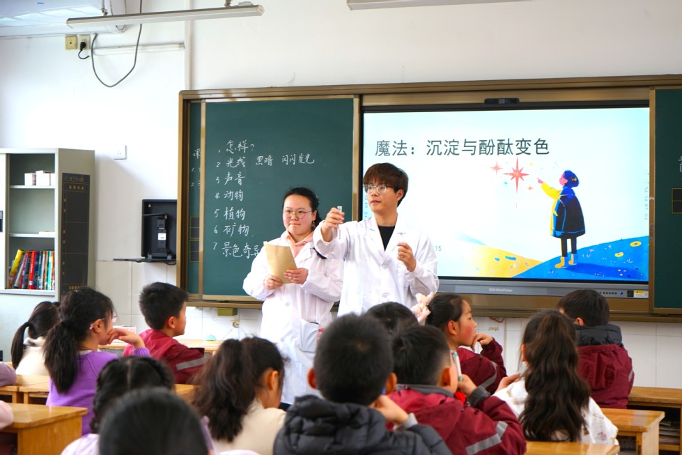 活動(dòng)現(xiàn)場(chǎng),志愿者們帶領(lǐng)同學(xué)們開(kāi)展兩項(xiàng)趣味化學(xué)實(shí)驗(yàn),同學(xué)們親手操作實(shí)驗(yàn)器材,觀察色彩變化與氣泡現(xiàn)象,在志愿者的講解中理解化學(xué)原理。隨后,志愿者們講述了長(zhǎng)征故事與“常州三杰”革命事跡,讓同學(xué)們感受先輩的堅(jiān)韌與赤誠(chéng),了解本地革命先輩的奉獻(xiàn)事跡。此次活動(dòng)為我院學(xué)子提供了實(shí)踐鍛煉的機(jī)會(huì),也為附屬小學(xué)的同學(xué)送去了化學(xué)知識(shí)與紅色滋養(yǎng)。